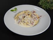 450g - piept de pui, bacon, ceapă roșie, ciuperci, smântână de gătit, penne, mozzarella -
